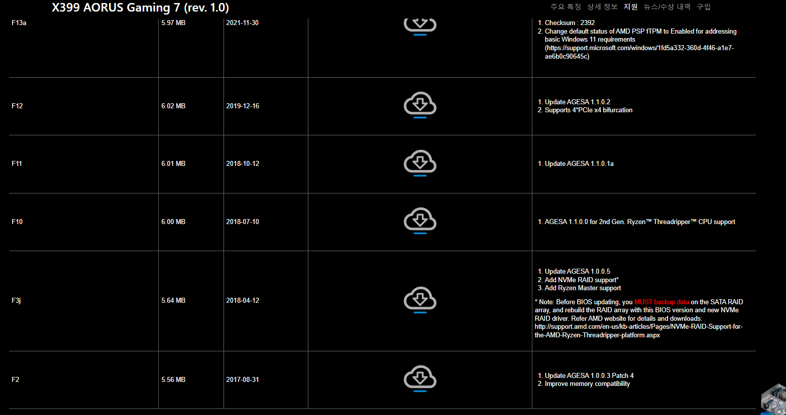 gigabyte 의 지원 페이지(https://www.gigabyte.com/kr/Motherboard/X399-AORUS-Gaming-7-rev-10/support#support-dl-bios) 를 확인해 보니, 그 동안 펌웨어가 몇 개 업데이트되어 있었다.